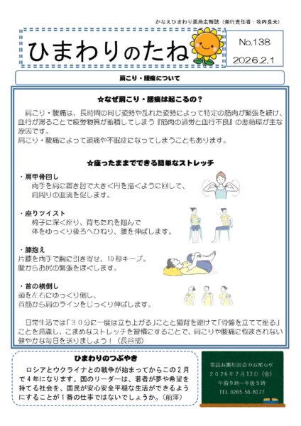ひまわりのたね2026年2月号 投稿日:2026年02月06日 カテゴリー:ひまわりのたね from:nono 今回は、肩こり・腰痛についてです。 座ったままできるストレッチになっているので、是非実践してみてください!